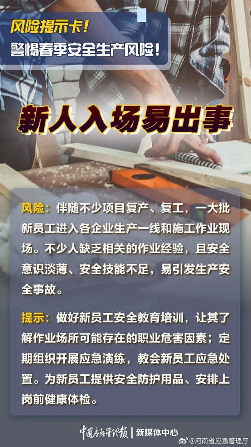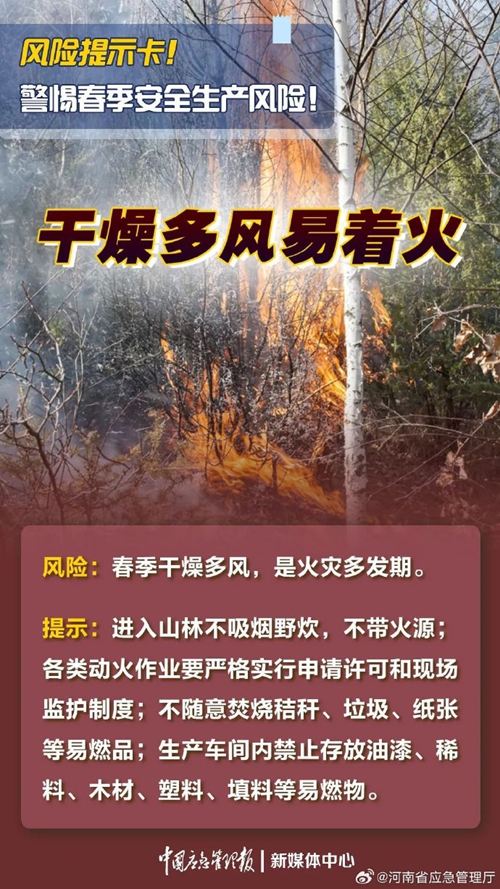 春季天氣多變,各行業(yè)復工復產(chǎn)步入正軌,生產(chǎn)節(jié)奏不斷加快的同時,應結(jié)合春季安全生產(chǎn)特點及時落實各項安全防范措施 ???。